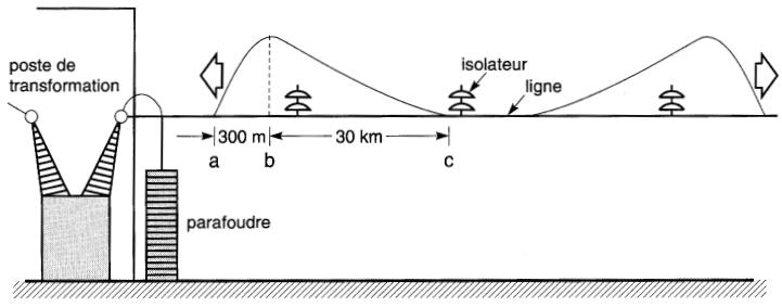 En effet, la tension peut monter de sa valeur normale à quelques centaines de kilovolts en 1 µs, ce qui correspond à la longueur du front ab de l'onde.