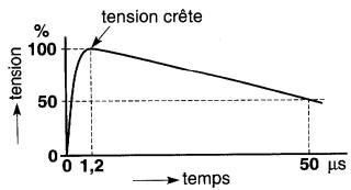 Cette onde de foudre atteint sa valeur crête en 1,2 µs et décroît à la moitié de cette valeur en 50 µs. Pour cette raison, l'onde est habituellement désignée par l'appellation « 1,2 X50».