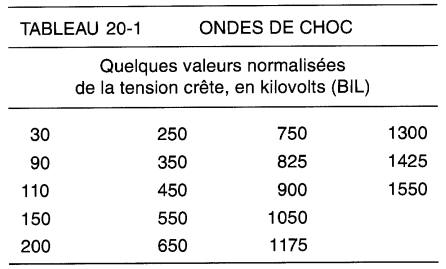 La tension crête peut prendre une série de valeurs normalisées comprises entre 30 kV et 2400 kV; quelques-unes sont affichées au tableau 20-1.