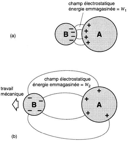 Tout comme l'énergie mécanique est convertie directement en énergie magnétique quand on éloigne les pôles d'un aimant (section Hystérésis et aimants permanents, l'énergie mécanique est convertie directement en énergie électrostatique lorsqu'on augmente la distance entre deux corps chargés.