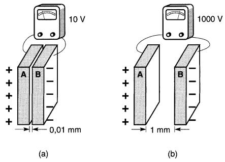 Par exemple, si l'on transfère seulement 1 nanocoulomb entre deux plaques ayant une superficie de 1 cm2 et séparées par une épaisseur d'air de 1 centimètre, il en résulte une différence de potentiel d'environ 10 000 volts (Fig. 20-2a et 20-2b).