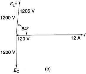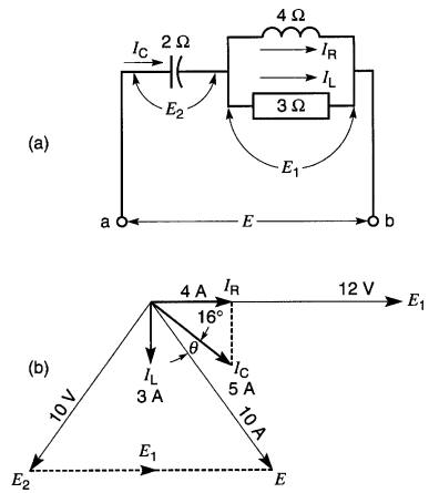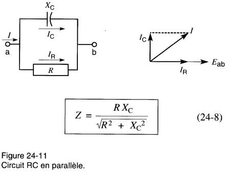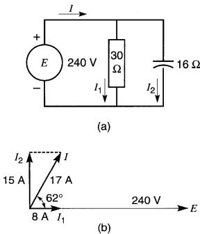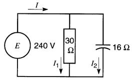 Le circuit de la Fig. 24-2a comprend une résistance de 30Ω et une réactance capacitive de 16Ω raccordées en parallèle sur une source de 240 V.
