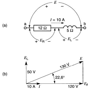 Soit un circuit (Fig. 24-3) formé d'une résistance de 12Ω en série avec une réactance inductive de 5Ω, et parcouru par un courant I de 10A.