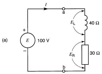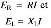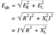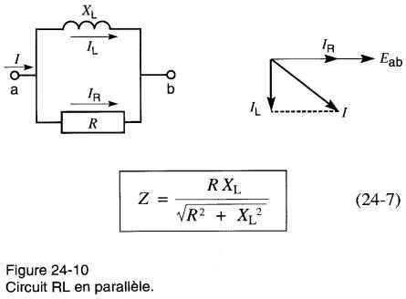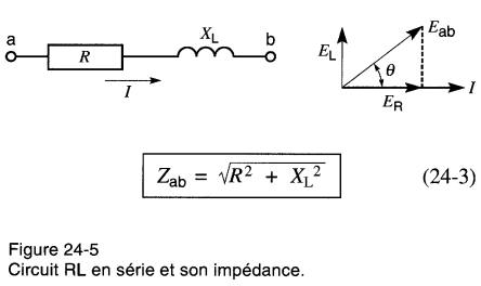 Puisque, dans une inductance, le courant I doit être déphasé de 90° en arrière de la tension, il faut tracer le vecteur EL dans une direction perpendiculaire à celle du vecteur I et de façon à ce que EL soit décalé de 90° en avant de I (Fig. 24-3b). La tension totale E aux bornes du circuit est donnée par la somme vectorielle de ER et EL.