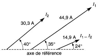 calculer la valeur du courant I1 et tracer le diagramme vectoriel, en montrant seulement les vecteurs E14, I1 et 12.