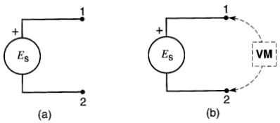 Supposons qu'un voltmètre fictif VM soit branché aux bornes de la source (Fig. 8-36b). En parcourant la boucle ainsi formée dans le sens horaire, on peut écrire l'équation