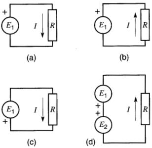 Le courant I produira une tension RI à travers la résistance. Le signe de cette tension dépend de la direction du courant et du sens dans lequel on parcourt la boucle.