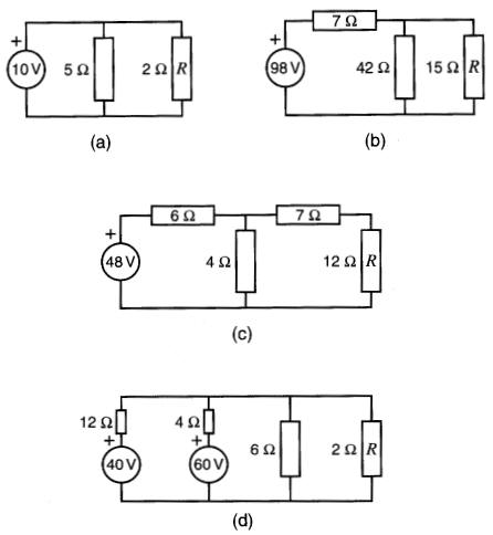 8-6 En utilisant le théorème de Thévenin, déterminer pour les circuits (a), (b), (c), (d) de la Fig. 8-40, la valeur et le sens du courant dans chacune des résistances R.