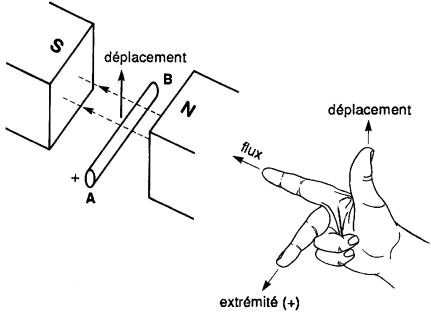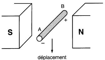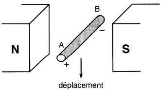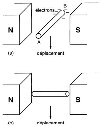 On trouve expérimentalement que si le conducteur est déplacé vers le bas, l'extrémité A du conducteur est positive (+) par rapport à l'extrémité B. Par contre, si le conducteur est déplacé vers le haut, l'extrémité B devient positive par rapport à A.