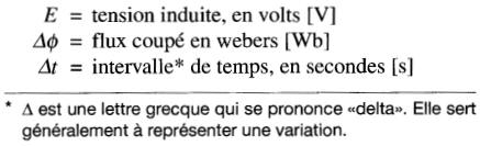 Selon ce principe une tension est induite dans un conducteur en mouvement dans un champ magnétique, ou plus généralement, lorsque le conducteur « coupe » les lignes de force d'un champ. Cette tension dépend seulement du taux de changement Δθ/Δt du flux balayé par le conducteur. Nous avons vu qu'une formule pratique permet de calculer la tension induite dans un conducteur rectiligne.