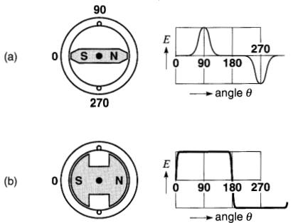 b. pôles larges avec entrefer uniforme produisant une tension e forme rectangulaire