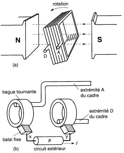 Ce courant est donc un courant alternatif ayant la même fréquence que la tension qui le produit. On peut réaliser un alternateur dans lequel l'aimant permanent est fixe et le cadre tourne (Fig. 17-18a).