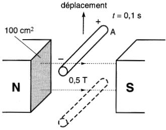Calculer la tension induite entre les extrémités d'un conducteur traversant le champ en 0, I seconde.