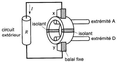 une lame est relié à l'extrémité A du cadre, et l'autre à l'extrémité D. Le collecteur tourne avec le cadre et la tension induite entre les lames est recueillie par deux balais fixes x et y qui frottent sur le collecteur.
