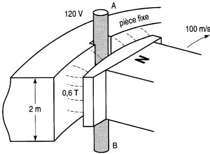 17-11 Un conducteur de 2 m de longueur se déplace à une vitesse de 60 km/h dans un entrefer où règne une densité de 0,6 T. Calculer la tension induite dans ce conducteur.