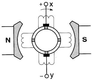 Pendant le deuxième quart de tour, le balai x, qui frottait précédemment sur la lame A, est maintenant en contact avec la lame D. L'inverse s'est produit pour le balai y. Bien que la polarité de chacune des lames ait changé, celle des balais est restée la même.