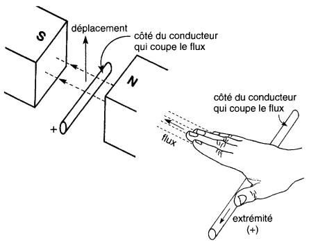 On peut trouver la polarité de la tension induite en se servant d'une règle simple, appelée règle des trois doigts de Fleming.