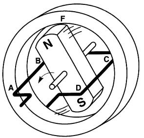 Supposons que l'aimant tourne dans le sens antihoraire à une vitesse uniforme de 1 tour par seconde. Il est évident qu'une tension est induite dans les conducteurs AB et CD quand ils sont coupés par le flux provenant des pôles N et S.