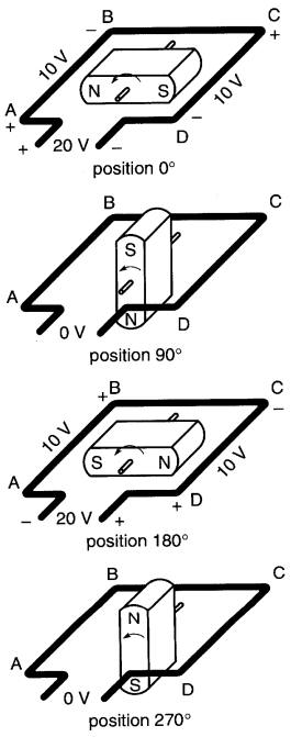 Déterminons la valeur et la polarité de la tension induite lorsque l'aimant, en tournant, occupe successivement les positions 0°, 90°, 180° et 270°. Ces positions correspondent respectivement à l'angle en degrés dont l'aimant a tourné par rapport à sa position initiale (Fig. 17-13).