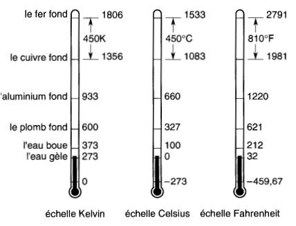 Les échelles de la Fig. 1-18 donnent la relation entre ces deux méthodes de mesure de la température. On y voit aussi l'échelle en degrés Fahrenheit.