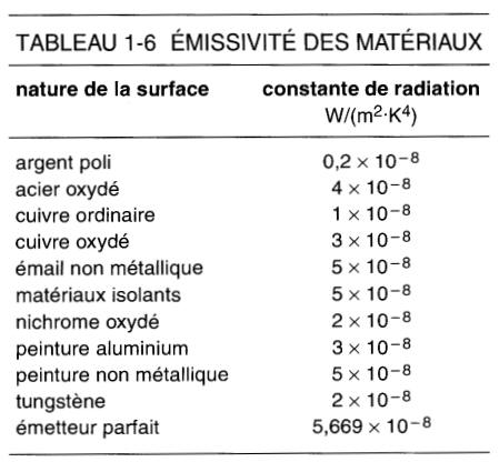 Le tableau 1-6 donne les valeurs de la constante de radiation k pour quelques surfaces que l'on peut rencontrer dans le calcul des pertes par radiation.