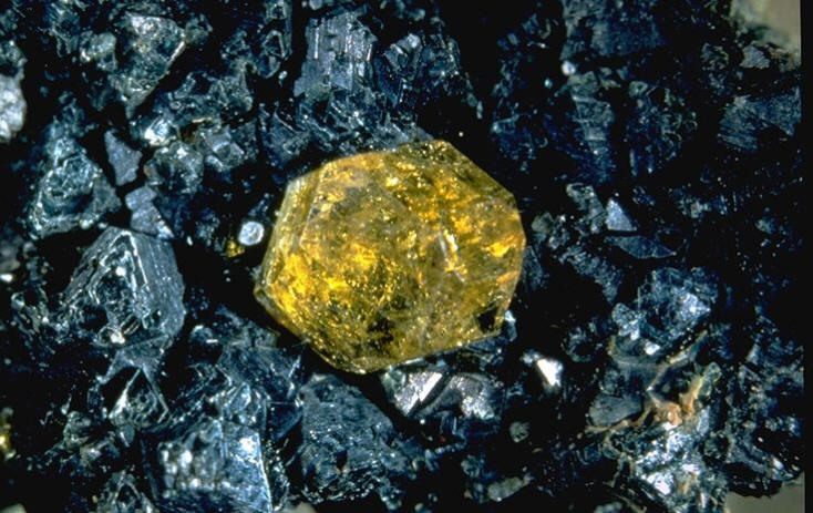C’est le terme ferreux du groupe des grenats. Il forme deux séries, avec le grossulaire et l'uvarovite. Il est typique des gîtes formés par métamorphisme de contact. Cristaux très fréquents, en général en forme de dodécaèdres ou de trapézoèdres. Souvent en grains irréguliers ou en masses grenues, transparentes à opaques. Couleur brun noir, vert (variété démantoïde), vert noir, noir (variété titanifère mélanite) à vert foncé, jaune (variété topazolite). Eclat vitreux à résineux. Très répandu, de beaux cristaux proviennent d'Arendal (Norvège), d’Alaska, du Val Malenco (Italie) et de l'Oural pour la variété démantoïde.