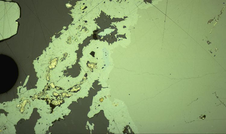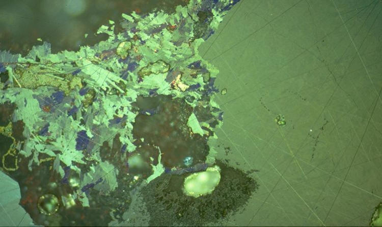 Teintes dans les gris-ardoise. Le minéral se corrode à la lumière de la lampe à xénon |