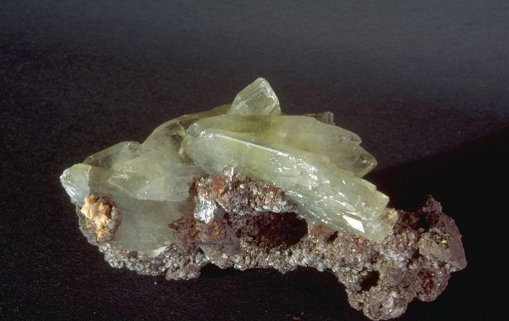 souvent en beaux cristaux tabulaires épais ou prismatiques |