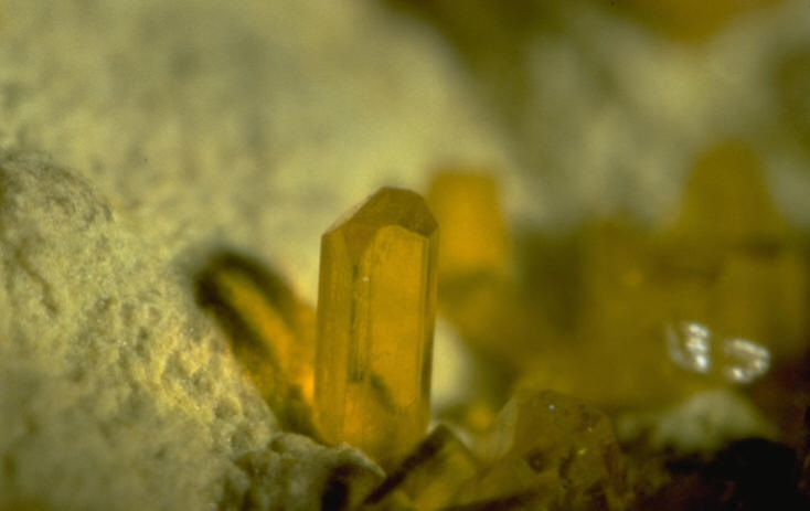 Minéral rare typique de la zone d’oxydation des gisements uranifères. Se présente en petites masses, en cristaux tabulaires ou allongés avec les faces striées. Couleur jaune brunâtre à ambre. Éclat adamantin à gras. Les meilleurs cristaux connus proviennent du Katanga.