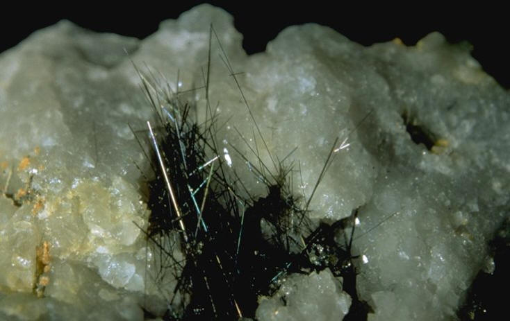 cristaux prismatiques fins, souvent groupés en agrégats aciculaires |