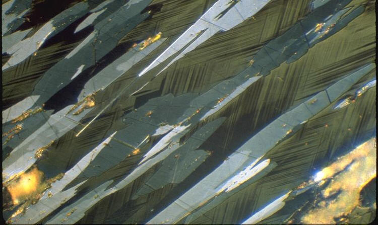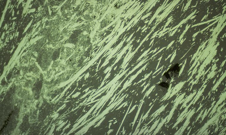 "cristaux aciculaires ou prismatiques, parfois en masses fibreuses (""plumosite"")" |