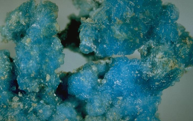 C'est un minéral secondaire de la zone d’oxydation des gisements de cuivre ; il se forme souvent dans les galeries de mines. Cristaux généralement prismatiques courts, moins communément tabulaires. Parfois massive, granulaire, concrétionnée, réniforme, stalactitique, également en veinules avec une structure fibreuse. Transparente à translucide. Éclat vitreux. Couleur bleu ciel à bleu de prusse. Poussière incolore. Il est ubiquiste dans les gisements de cuivre.