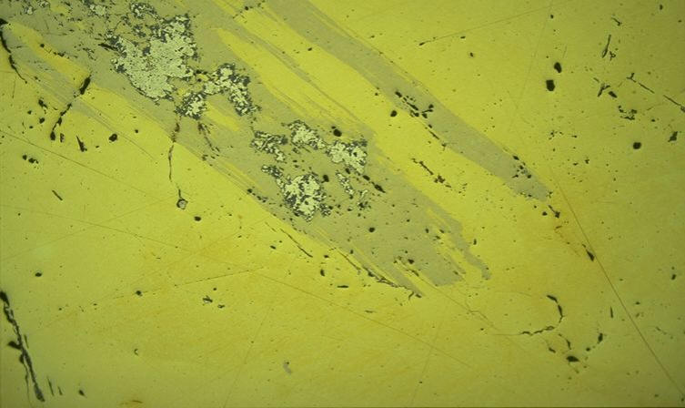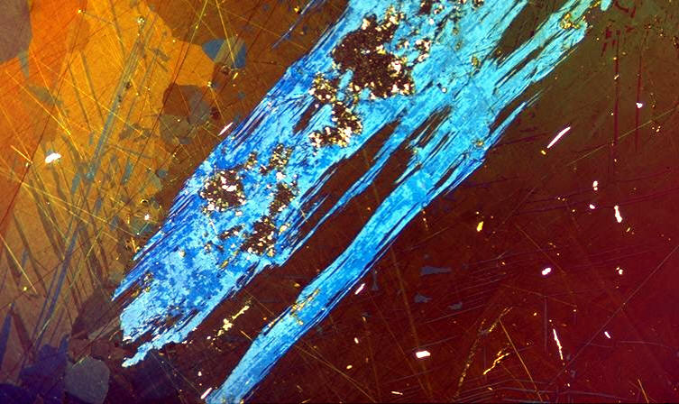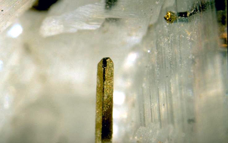 cristaux aciculaires rares, surtout en masses ou en lamelles dans la chalcopyrite |