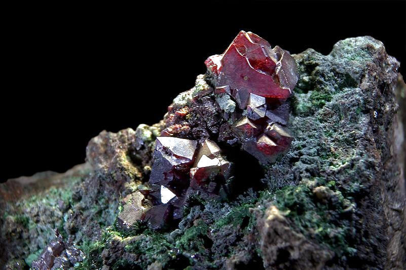 Minéral commun de la zone d'oxydation des gisements de cuivre, fréquemment cristallisé. Les cristaux présentent la forme de l’octaèdre, moins souvent du dodécaèdre ou du cube. Les cristaux sont occasionnellement très modifiés. En masses de cristaux aciculaires. Massive, granulaire, terreuse. Translucide. Éclat adamantin à submétallique. Couleur rouge carmin plus ou moins foncé, parfois presque noir. Poussière rouge-brun brillante. Rayure brillante dans les brun-rouge. Les principaux gisements ayant fourni de beaux échantillons sont ceux de Redruth (Cornouailles, Angleterre), de Tsumeb (Namibie) et de Chessy (Rhône, France).