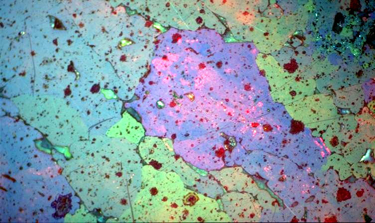 En décroisant un peu les nicols, on fait apparaître des tons verts à bleus, souvent masquées par des réflexions internes rouges abondantes |