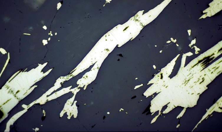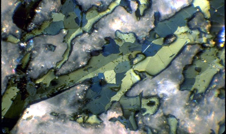 Teintes vertes caractéristiques. En décroisant les nicols, on fait apparaître plusieurs nuances de vert. En décroisant plus on arrive à des teintes bleues à jaunes, rappelant celles de la millerite |