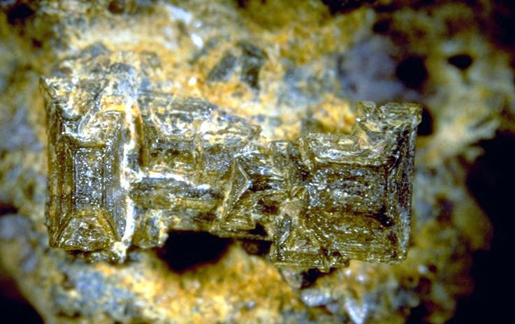 cristaux rares, formant des prismes aplatis, généralement en agrégats, masses grenues ou grains arrondis |