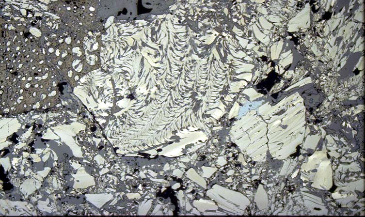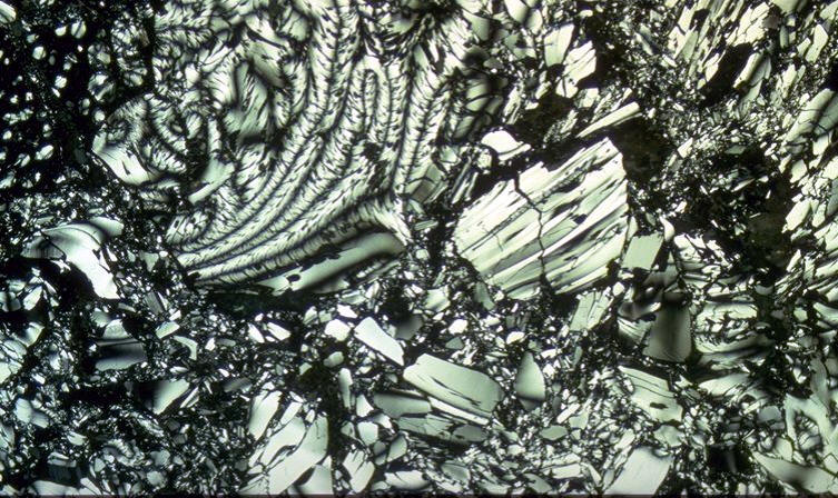 cristaux rares, surtout en lamelles aplaties à clivage micacé et en masses lamellaires micacées |