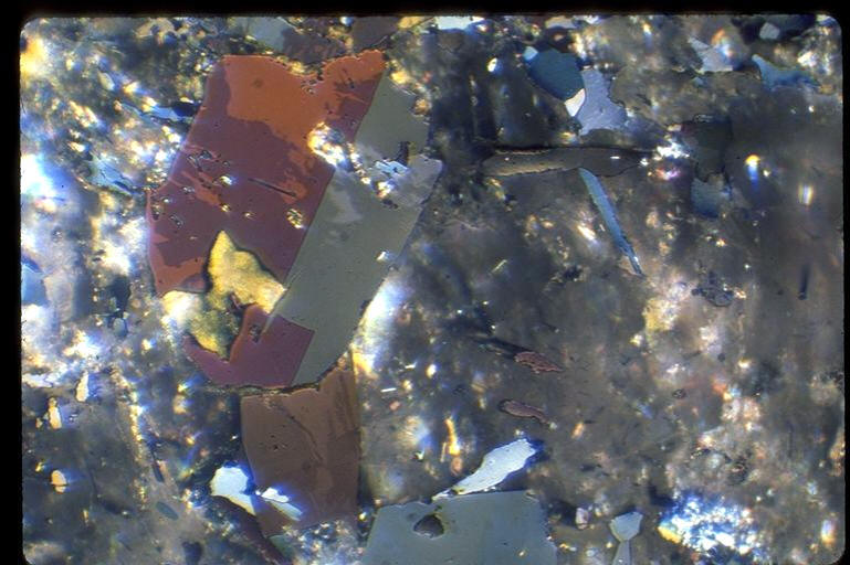 Tons plus colorés que l'arsénopyrite : orangé à bleu avec nicols bien croisés. En décroisant les nicols, on observe des teintes rouge orangé à verdâtre clair |