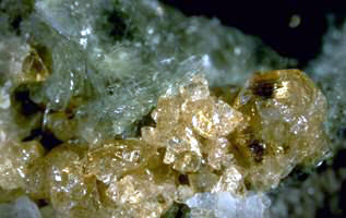 Il forme avec la chondrodite et la clinohumite le groupe de l’humite. C’est un minéral typique des roches du métamorphisme de contact affectant les calcaires et les roches plutoniques alcalines. Cristaux lenticulaires, plus rarement isométriques ou tabulaires riches en faces. Massive, compacte en grains arrondis ou en agrégats grenus. Translucide à transparente. Eclat vitreux à gras. Couleur jaune nuancé de rouge à brun-rouge. Poussière blanche. De très beaux cristaux sont connus au Vésuve (Italie) et à Tilly Foster (New York).