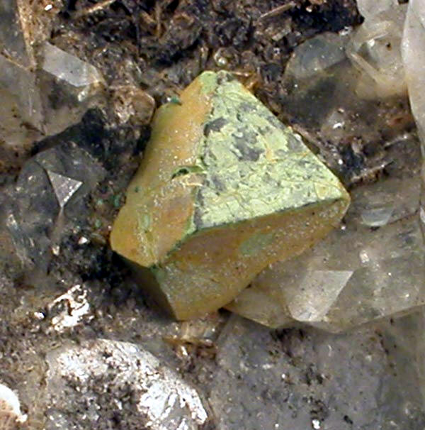 habituellement en masses grenues, cristaux pseudo-dodécaèdriques très rares |