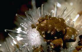 souvent en cristaux rhomboédriques, plus rarement prismatiques, également massive |