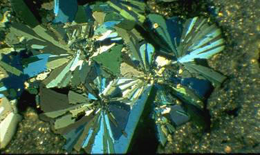 "cristaux tabulaires, rarement prismatiques, souvent à faces courbes. macle fréquente en ""crête de coq"". Aussi en masses fibro-radiées" |