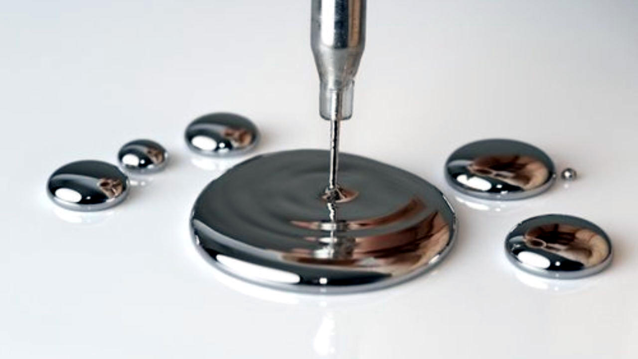 Le mercure natif est un minéral liquide jusqu’à -39°C et se vaporisant à 350°C ( vapeur très toxique). Présentant un fort éclat métallique, il est très brillant et possède une couleur blanc d’étain. Le mercure natif est un minéral présent dans de nombreux gisements de mercure, mais rarement en quantités significatives. Il s’y présente en gouttelettes associées le plus souvent au cinabre et à divers minéraux secondaires de mercure.
