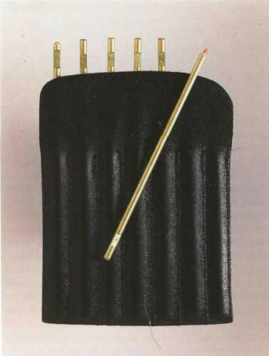 Trousse de dureté, contenant des tiges métalliques dans lesquelles sont fixées des esquilles de minéraux. |