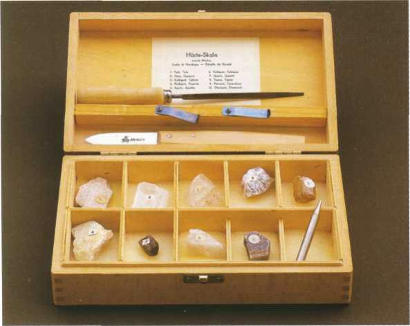 Échantillons de référence pour l'échelle des duretés selon Mohs. Y sont adjoints une pointe en acier, un couteau et une lime, comme autres moyens simples de détermination de la dureté.