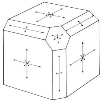 Différences de duretés à la surface d'un cristal de diamant. (D'après E.M. et J. Wilks). Plus les flèches sont courtes, plus la résistance à l'abrasion est grande dans cette direction.