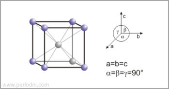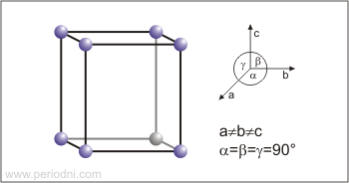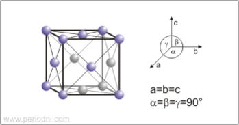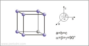 La maille élémentaire (ou solide primitif) du réseau cubique est un cube. Les trois axes cristallins (a, b, c) sont de longueur égale et les angles qu'ils forment entre eux sont tous égaux à 90°. Les éléments caractéristiques de symétrie sont les axes ternaires, toujours au nombre de 4 (4A3).