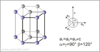 La maille élémentaire est un prisme droit à base losange. La combinaison de trois de ces mailles forme un prisme hexagonal. Ce système comporte 2 axes égaux (a et b) formant entre eux un angle de 120° (g), le troisième axe, c, est perpendiculaire au plan formé par a et b (a = b = 90°). L'élément caractéristique du système est un axe de symétrie d'ordre 6 : A6. Ce système comporte 5 classes de symétrie.
