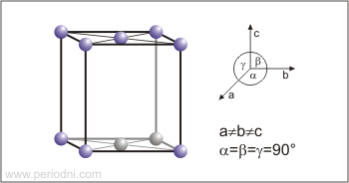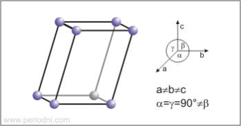 La maille élémentaire est un prisme incliné à base losange, le prisme clinorhombique. Les trois axes sont de longueurs différentes et seuls deux angles sont égaux à 90° ; le troisième est caractéristique de l'espèce minérale. Ce système comporte 3 classes de symétrie.